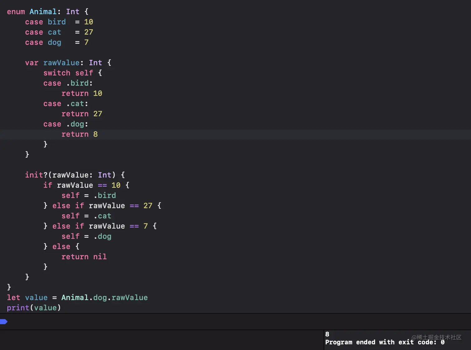 底层逻辑就是这样的,有趣的是,如果我们自己实现了这些方法,那么编译器就不会自动生成这些方法。比如说,你在匹配到.dog时,返回的是8,那么你获取rawValue的时候,获得的是8,并不是你在定义中的7,就像这样: