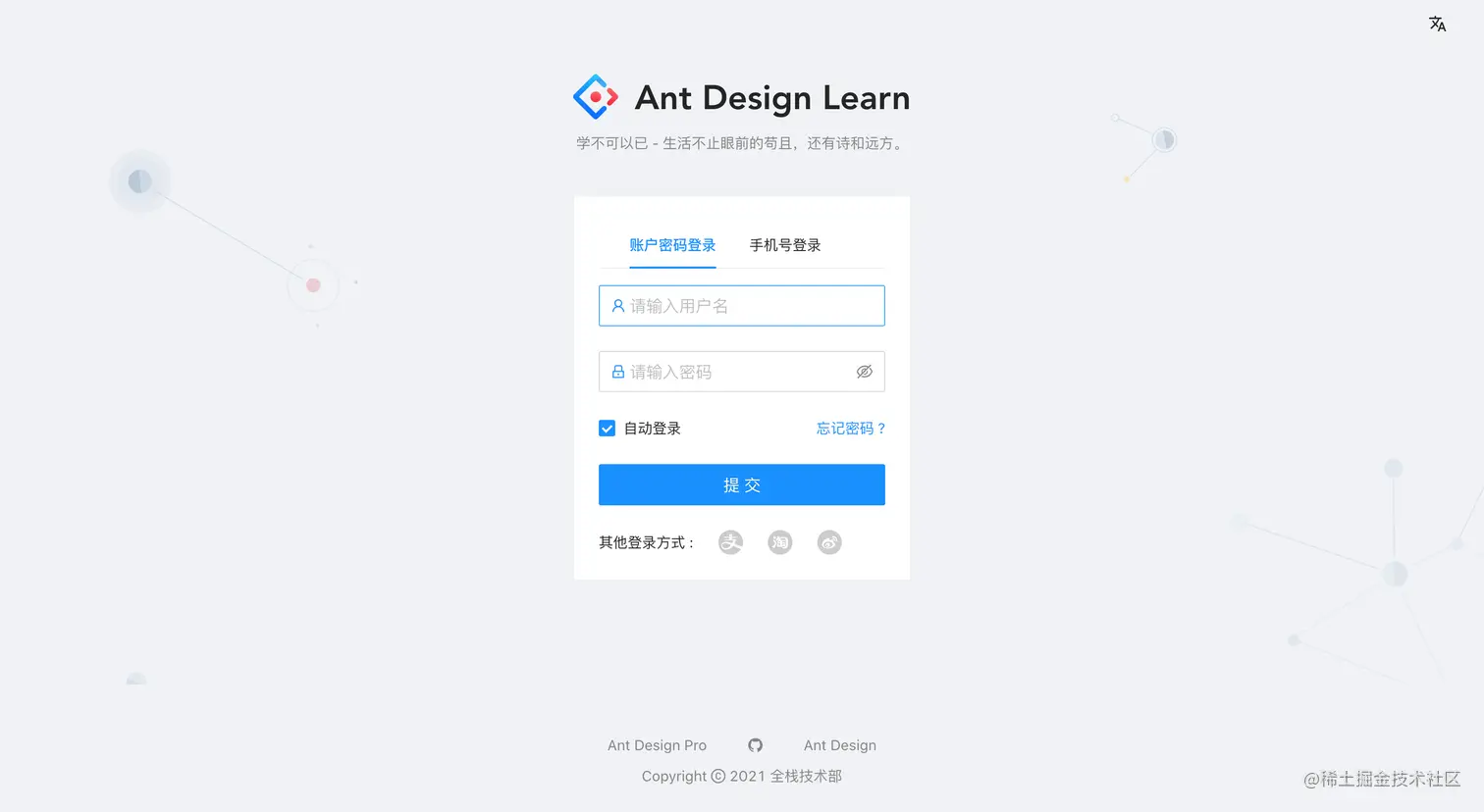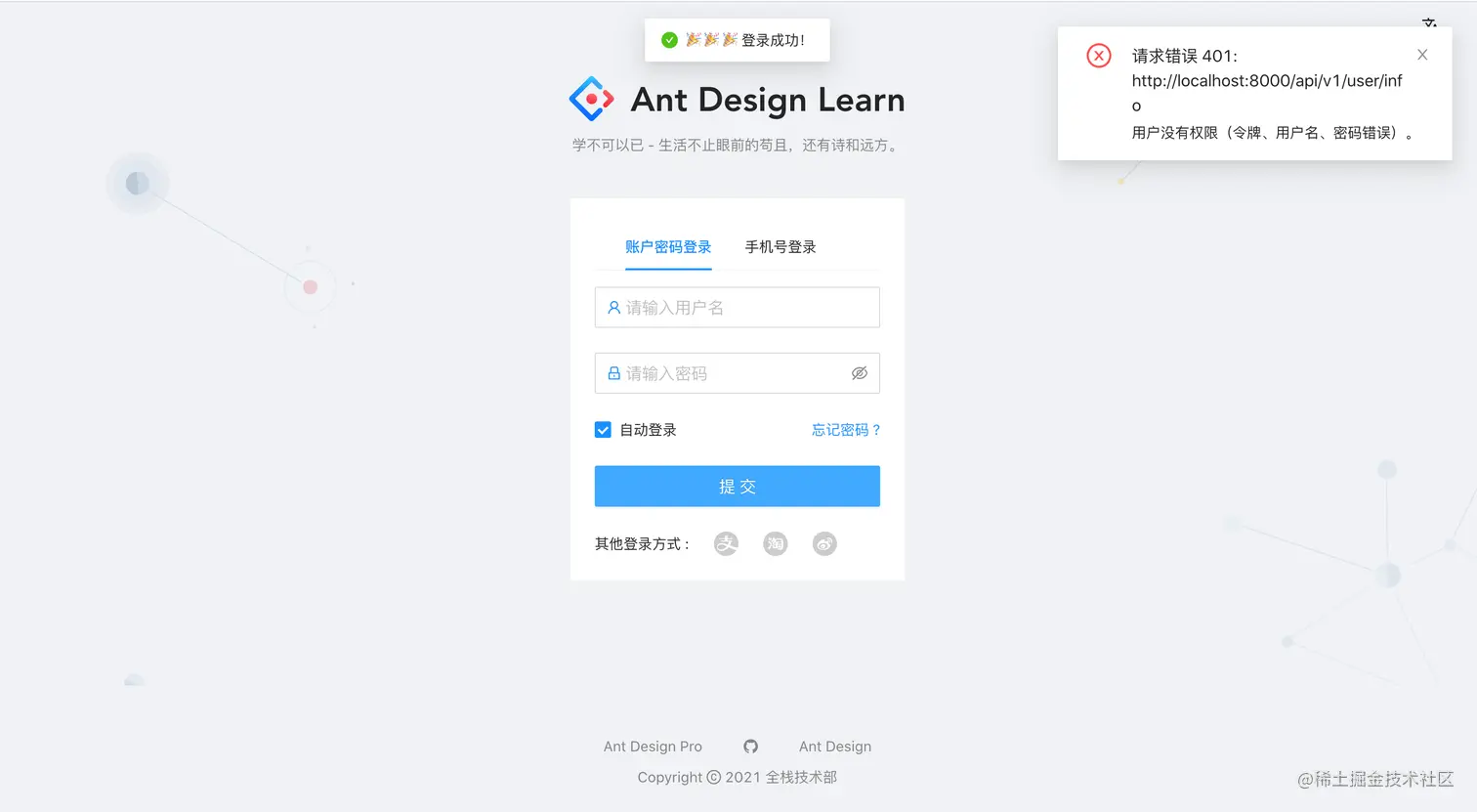 使用这些账号都是走自带 mock 接口,admin/user 账号区分了权限,菜单路由会显示不同菜单