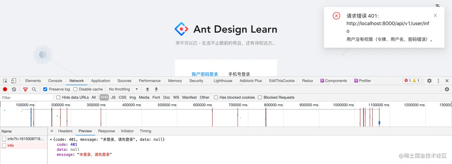 这个时候为正常的逻辑,因为访问首页会去获取用户信息接口,用户信息接口需要权限才能访问,所以跳转到登录界面。