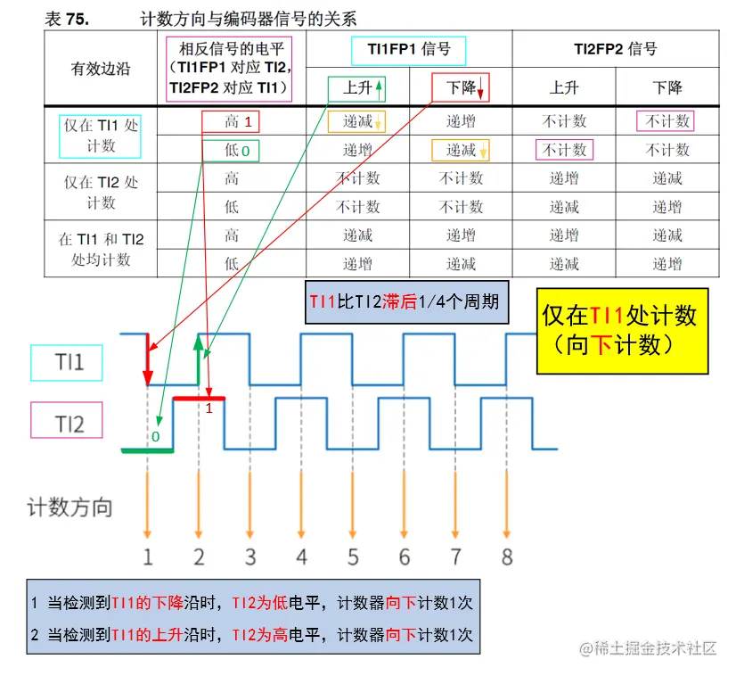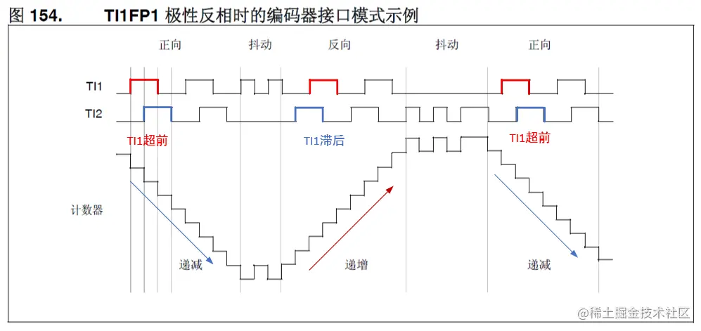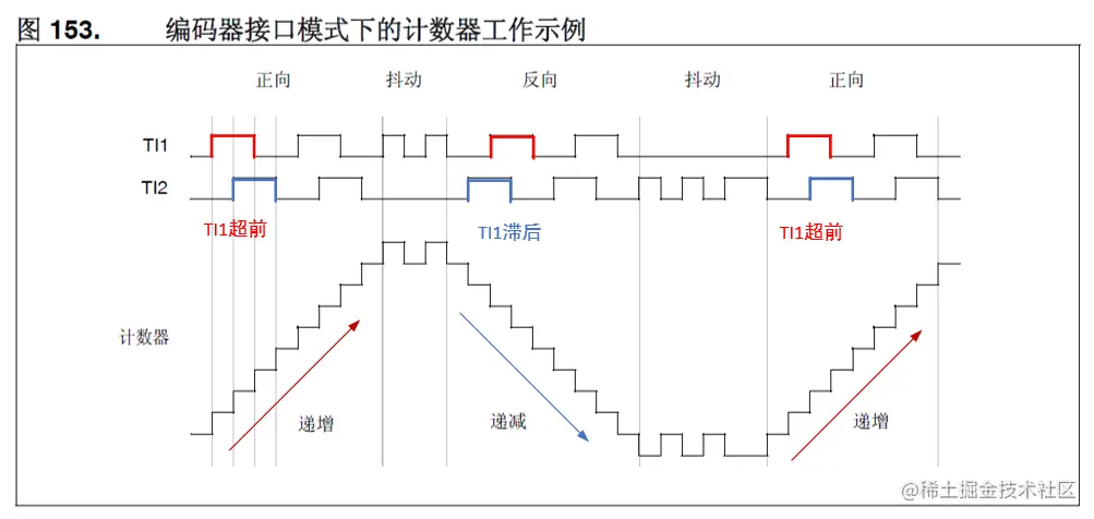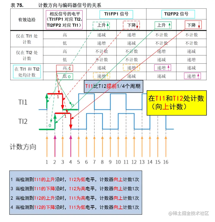 假定电机正转时,编码的通道A的信号比通道B提前1/4个周期(也即相位提前90度),在通道A的上升沿与下降沿均计数(如下图TI1波形中的绿色和红色箭头),因为计数的方向代表的电机转动的方向,所以,在正转的情况下: