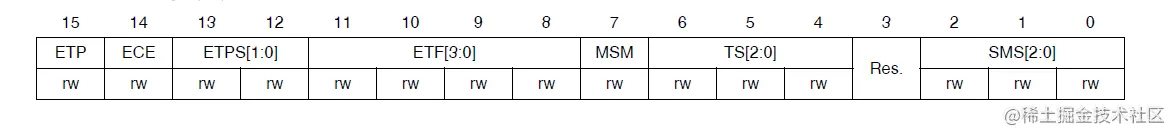 SMCR即从模式控制寄存器(slave mode control register),查阅STM32F4的参考手册,可以找到类似如下信息,现在我们只需关注SMS这几位: