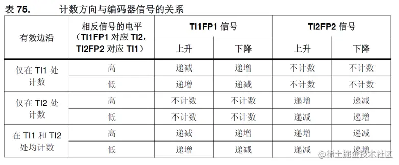 00或01。另一方面来看,编码器模式下,只能通过SMCR的模式设置倍频,要么是2倍频,要么是4倍频,貌似不能设置1倍频(只对1个通道的上升沿或下降沿计数)。
