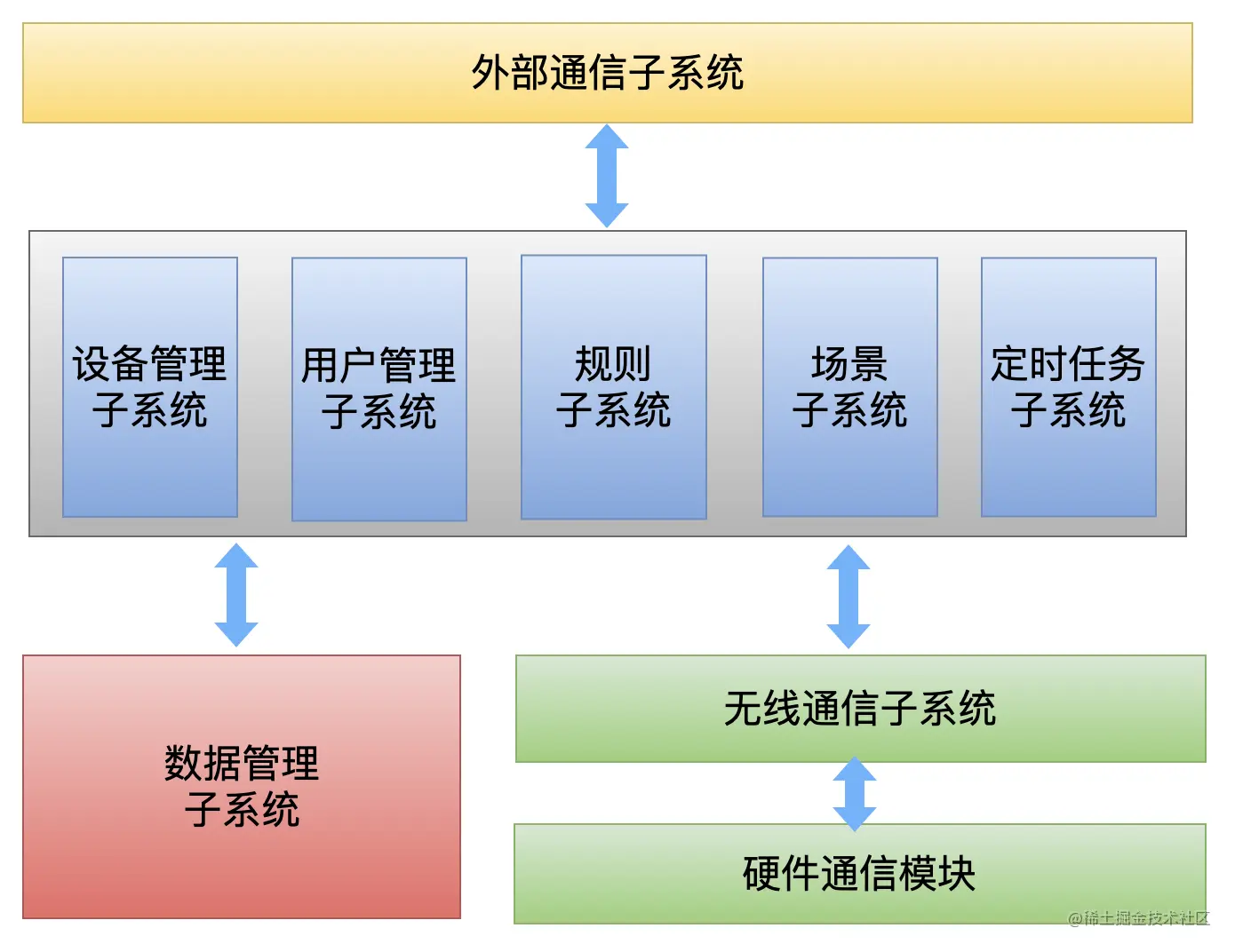 这张图就从上层组件的视角,把整个系统划分为几个子系统,每一个子系统都是一个独立的、可以交付的实体模块。