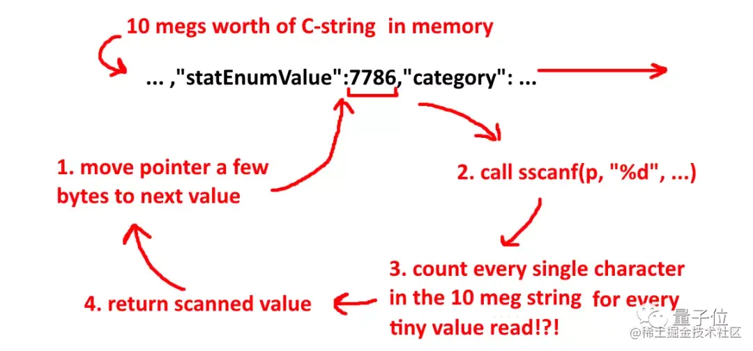 在具体运行时,sscanf对于每个有效值,逐个读取每一个字符,然后返回结果,之后指针移向下一个值,循环往复……直到把10M文件全部扫一遍。