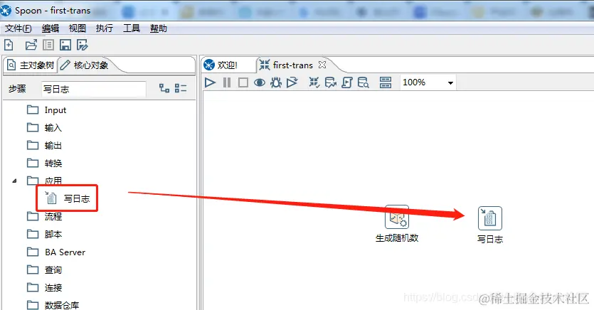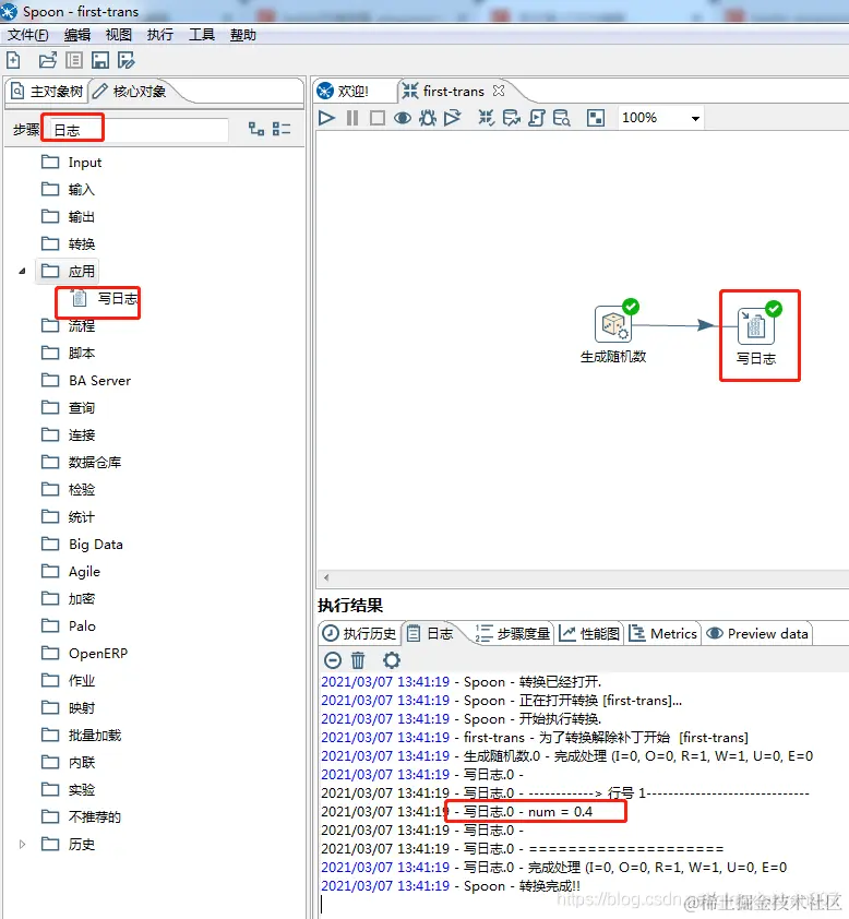 上篇文章主要讲解了如何搭建kettle的使用环境,如何编写和运行第一个转换,并在最后通过两种方式查看运行结果,第一种是通过debug的形式,第二种是通过日志节点进行展示。当然,第二种形式并没有进行详细的讲解,希望大家自行完成。本篇将把第二种展示方式进行讲解,并通过讲解节点使大家对节点感兴趣,自行去挖掘各种节点的使用;除此之外,本章还将讲述如何编写第一个作业;使大家掌握编写作业的能力。