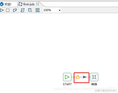 第三步:用"hop"(连接箭头),连接“START”节点和“转换”节点;箭头中间带有一个锁标志(代表是作业,不必在意);