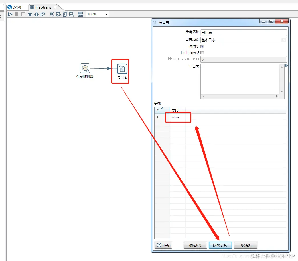 第三步:双击“写日志”节点,打开如下对话框,点击获取字段,此时“num”字段就已经展示出来了,如下图,点击确定。