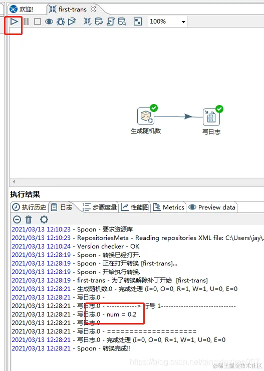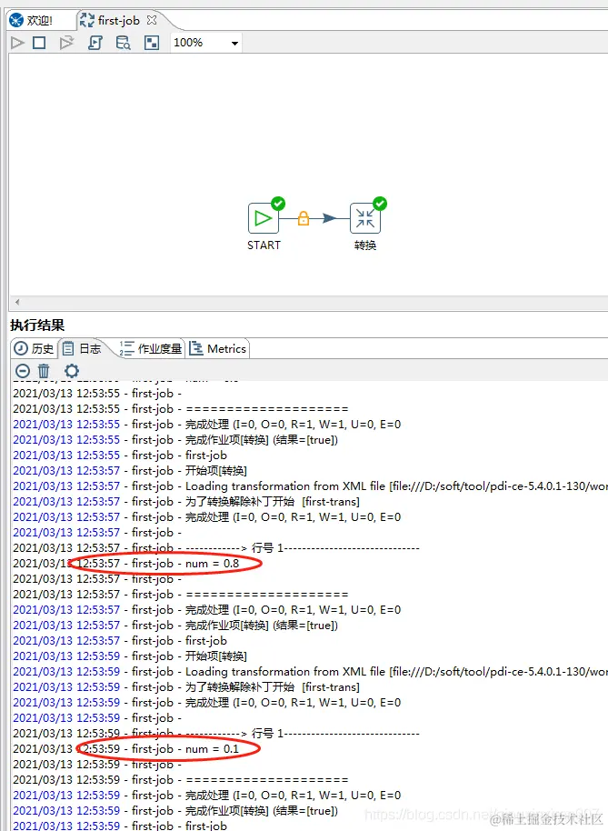 第四步:执行作业;点击执行按钮(三角形按钮);执行结果:可以看到是每隔2秒钟执行一次转换,分别打印了num=0.8 和num=0.1;