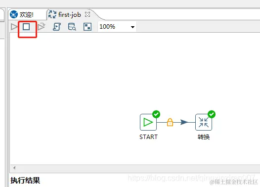 第五步:关闭执行;上述作业是在每2秒执行一次(并没有结束条件判断,是不会结束的),所以需要手动停止;点击左上角的正方形按钮(停止按钮);