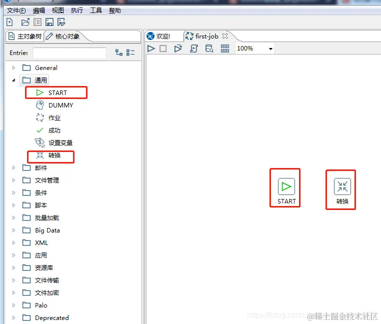 第一步:新建一个转换(文件——》新建——》作业——》并命名为 first-job),并拖拽一下节点(START节点和转换节点)到工作区;如下图:
