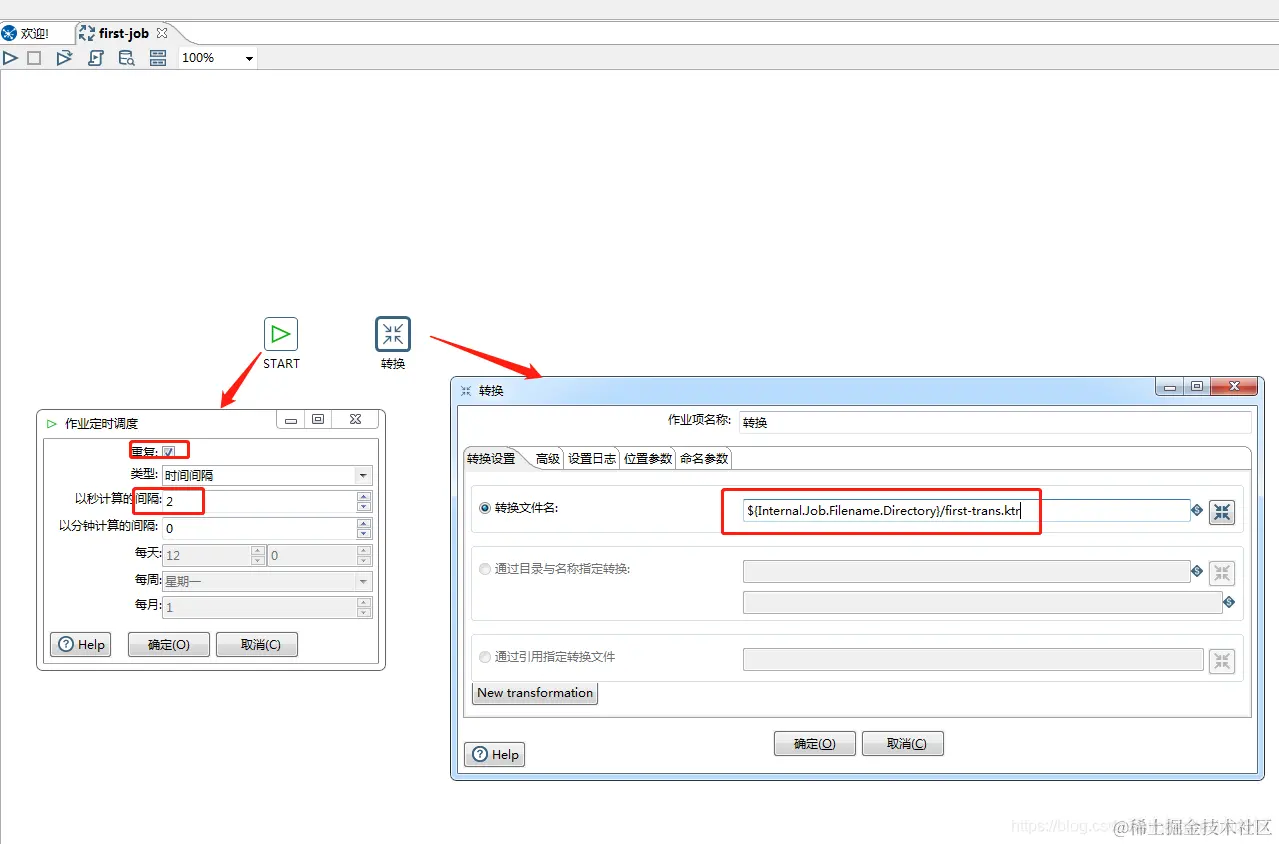 第二步:配置节点。“START”节点配置如下信息:允许重复,每2秒钟执行一次;“转换”节点配置如下信息:转换文件选中第一个转换(日志形式查看结果)的源文件;如下图所示: