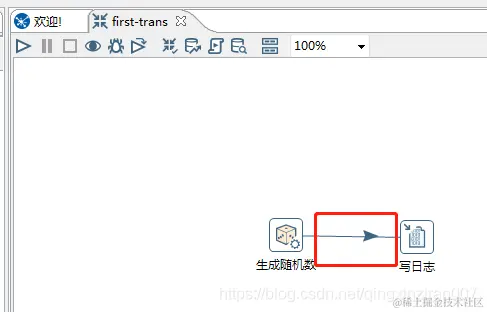 第二步:首先鼠标左键选中“生成随机数”节点(不要松开),然后按着shirft键,拖动鼠标箭头从“生成随机数”节点到“写日志”节点,然后松开鼠标左键;最后如下图所示: