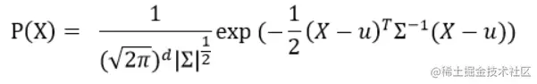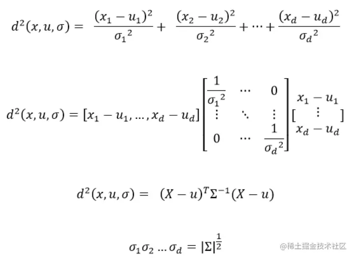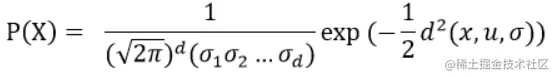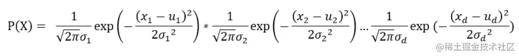 上式中是协方差矩阵,由于变量各个维度之间不相关,因此协方差矩阵只有对角线的位置有值,因此推导出多元高斯分布的概率密度函数为: