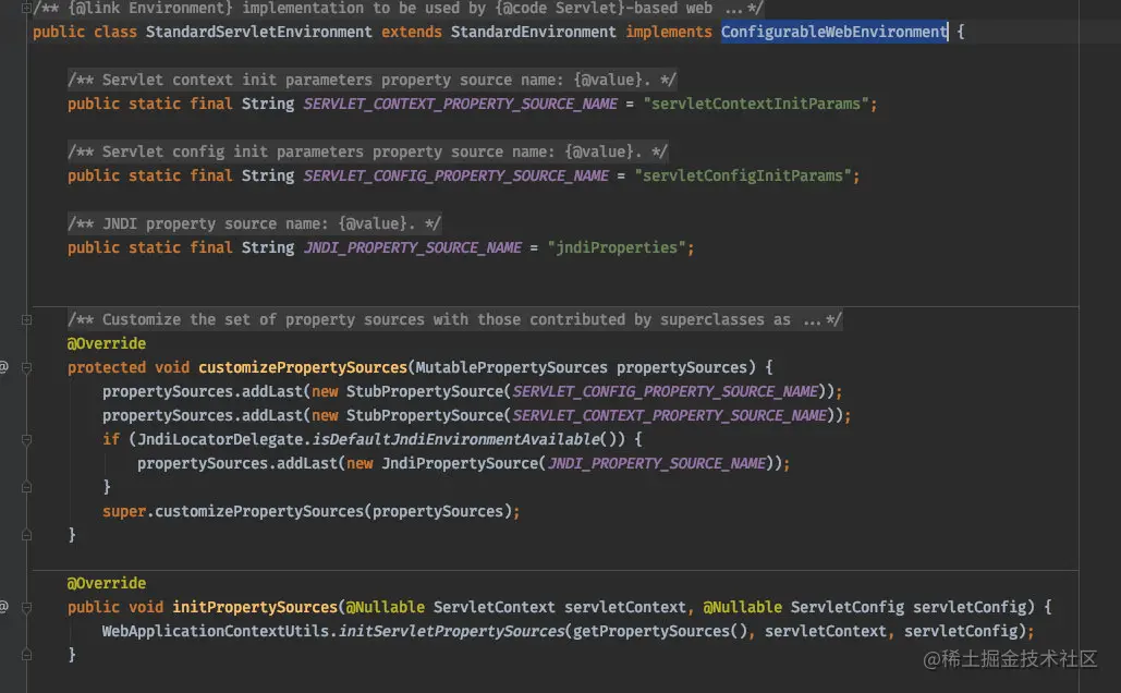而StandardServletEnvironment 则是增加了 servlet相关的两个属性源、并且实现了初始化属性源的方法。将