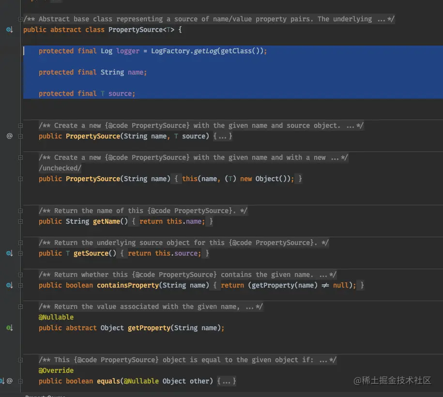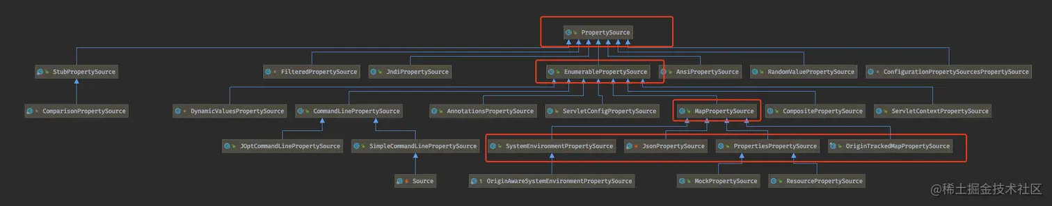 PropertySource 非常类似于 Map,数据源可来自 Map、Properties、Resource 等。PropertySource 接口有两个特殊的子类:StubPropertySource 用于占位用,ComparisonPropertySource 用于集合排序,不允许获取属性值。