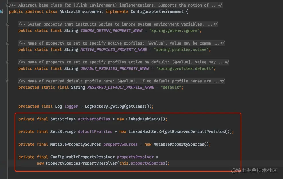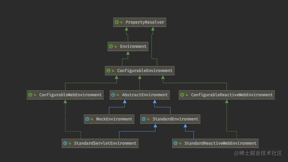 Environment 这个接口代表应用运行时的环境。它代表了两方面、一个是 profile 一个是 properties。访问 property 的方法通过 Environment 继承的接口 PropertyResolver 暴露出去。