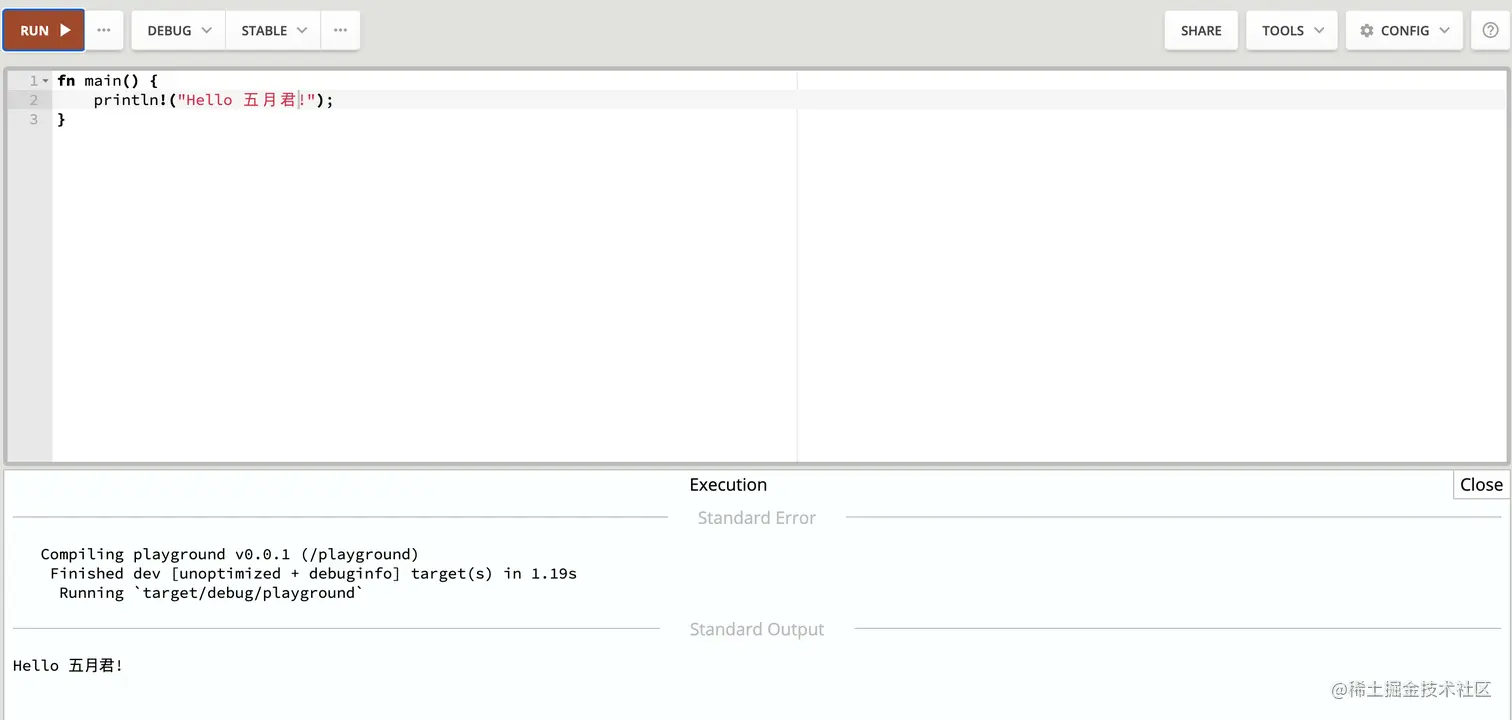 如果你不想在本地电脑上安装,想尽快尝试下 Rust 可通过其提供的在线代码编辑器。