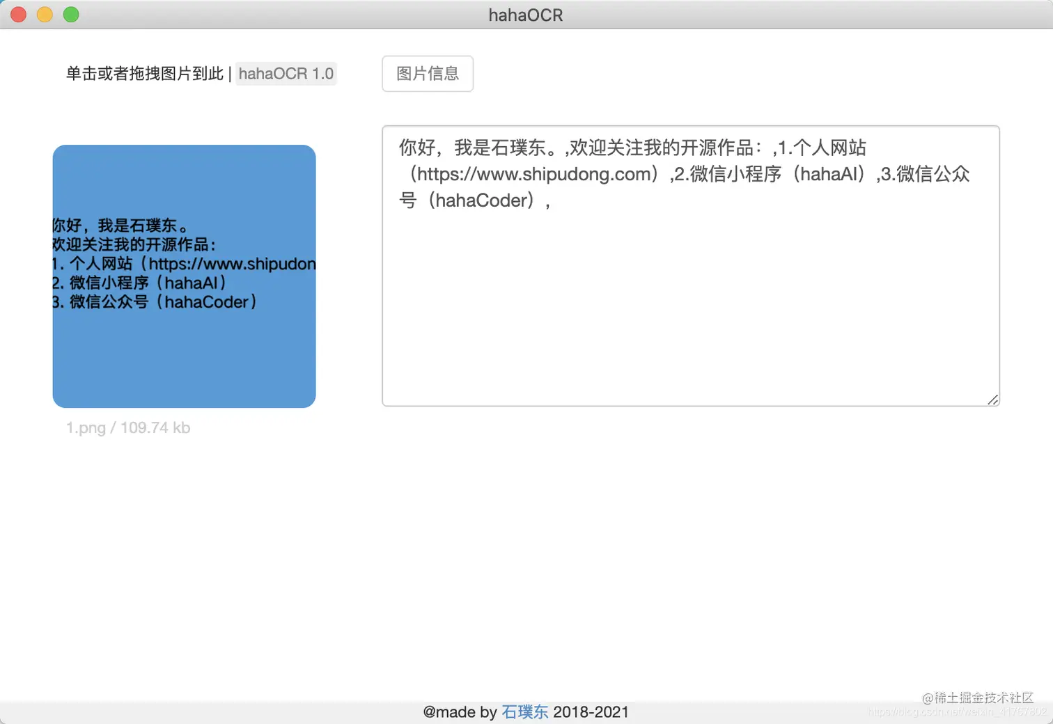 最后,我们来看一下本文最开始提到的hahaOCR案例中的文件处理模块,实现该逻辑功能的思路其实很简单:用户通过按钮或拖拽操作上传图片,上传成功之后调用接口将图片中的文字信息显示在<textarea/>中,接下来,我们来看一下实现该功能的代码: