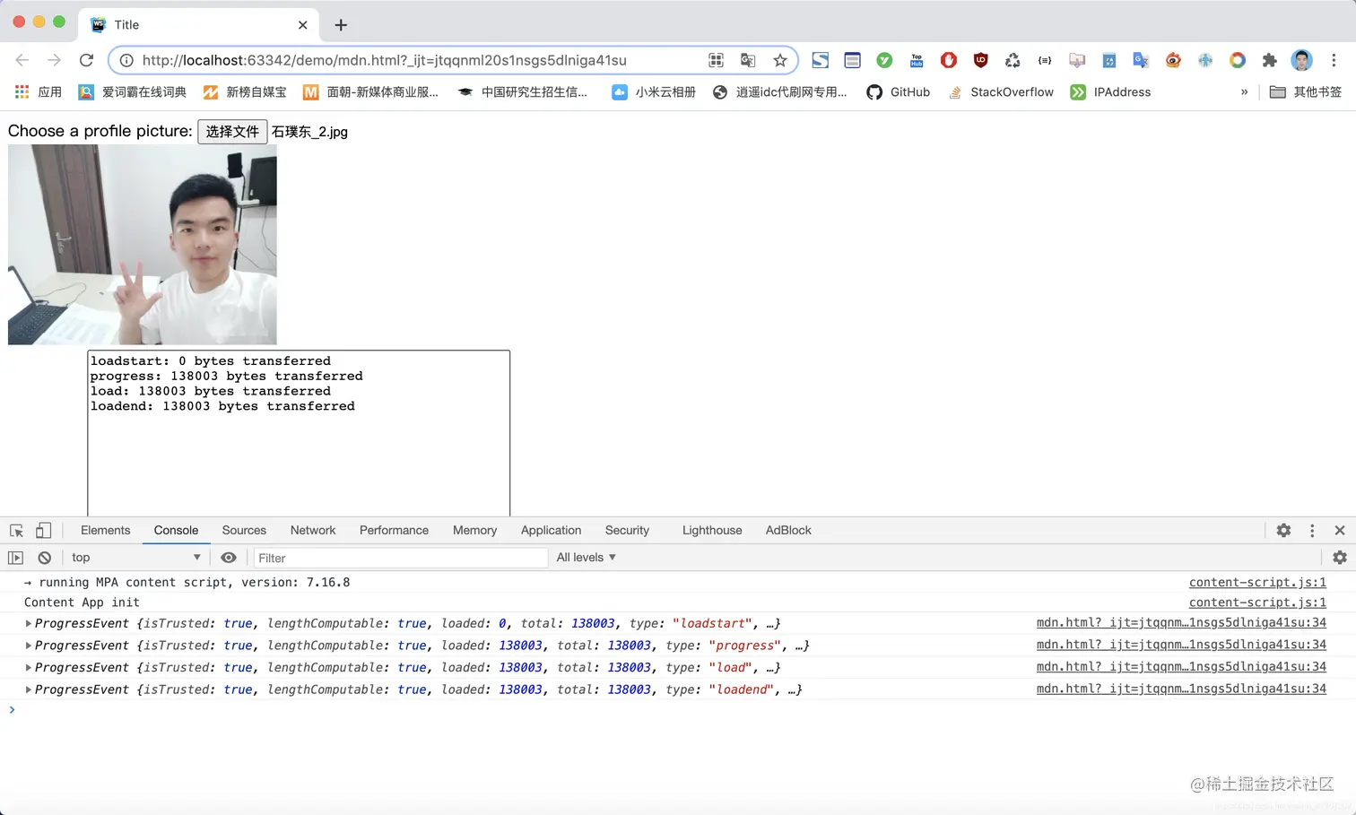 上述代码中,我们仅对用户上传的第一个图片文件进行处理(通过readAsDataURL方法读取);我们还通过EventTarget.addEventListener方法将FileReader指定的6种监听器(事件处理程序)注册到reader上;最后当触发load事件时,将读取成功之后的内容,即data:URL格式的Base64字符串赋值给空<img/>标签的src属性,并最终显示在页面中,请看演示效果: