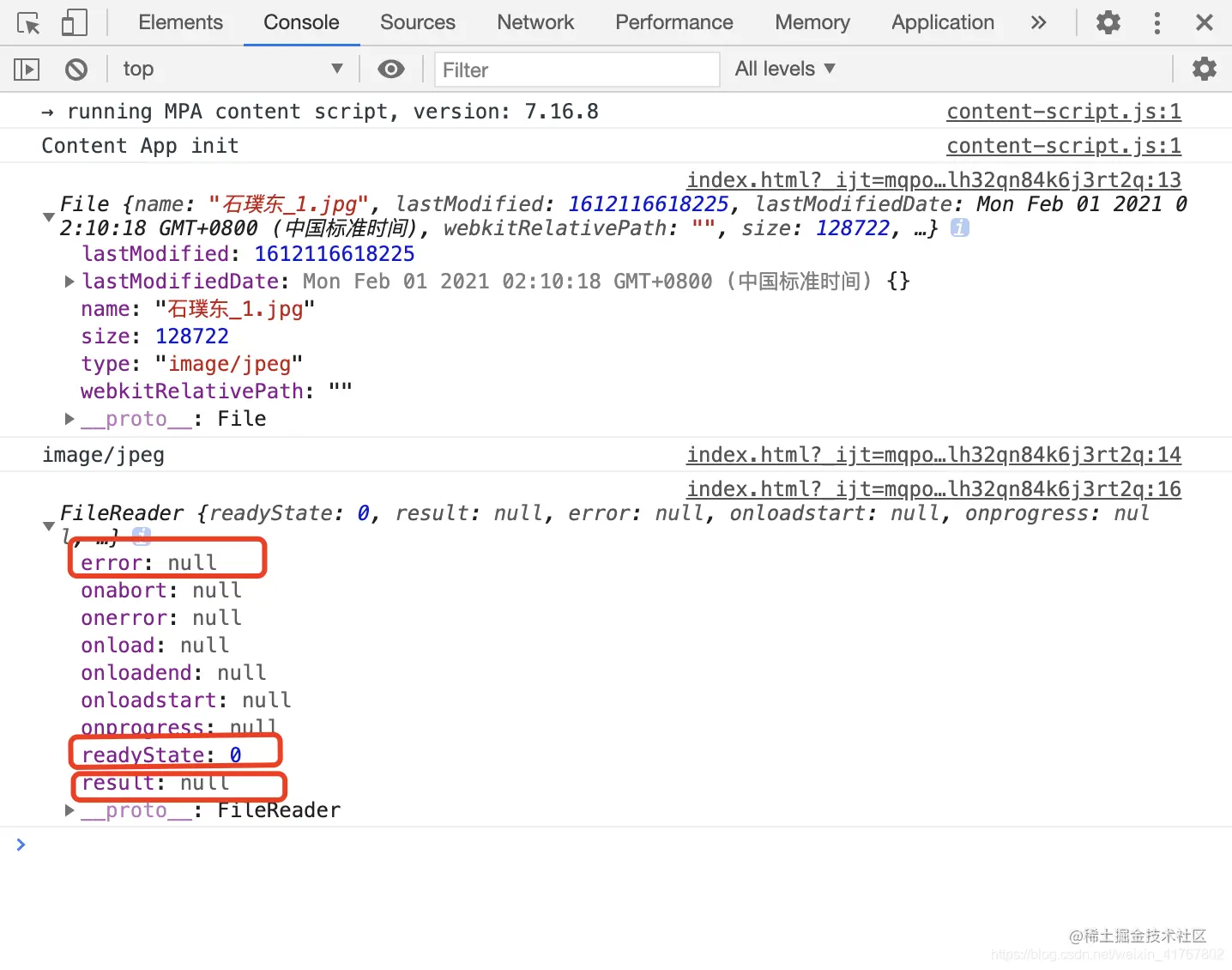 我们在上述代码中指定了三个console,第一个console输出了用户所上传文件的相关信息;第二个console输出了用户所上传文件的type;第三个console输出了FileReader实例的相关信息,请看解释: