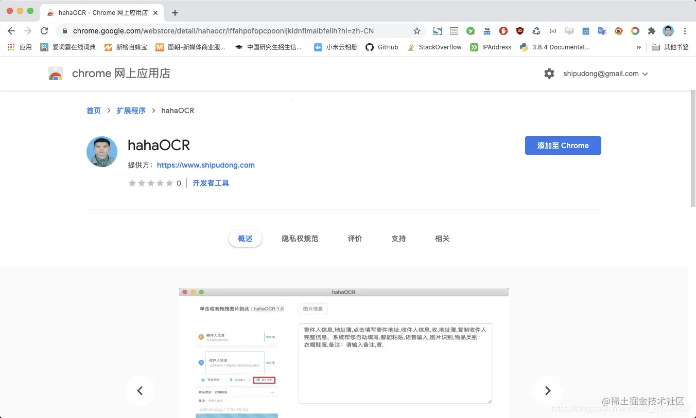 我在Google Chrome Web Store上发布了一个案例hahaOCR,该扩展程序可以帮助用户识别出图片中的文字信息,并以文本形式显示,大家可以在chrome网上应用商店中找到我发布的应用程序,如图所示: