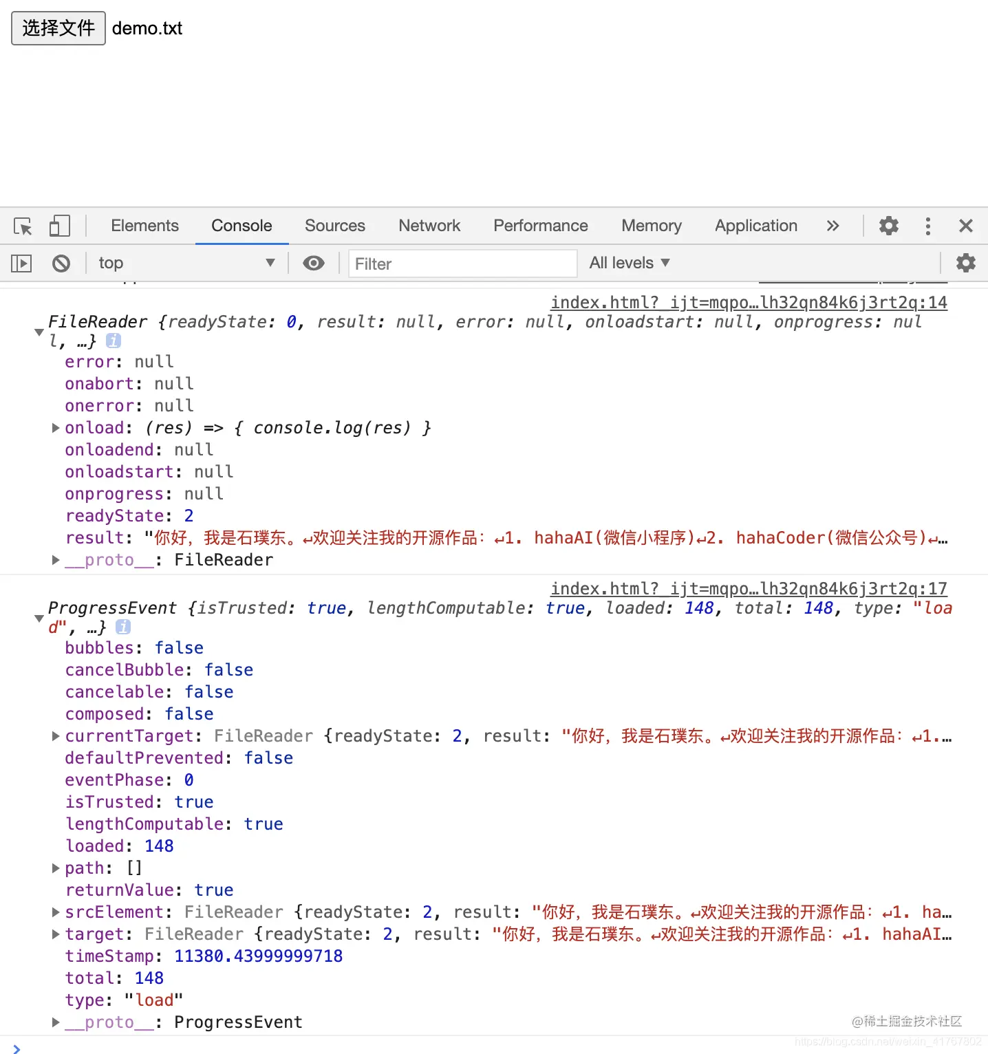 为了更加直观的解释FileReader的三个属性,我们来看一段简单的代码: