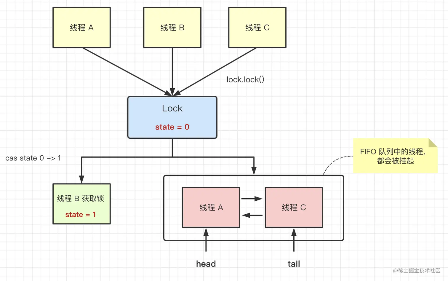state通过 cas 更新为 1。 - 线程 A、C 因为更新失败,所以也就抢占失败。