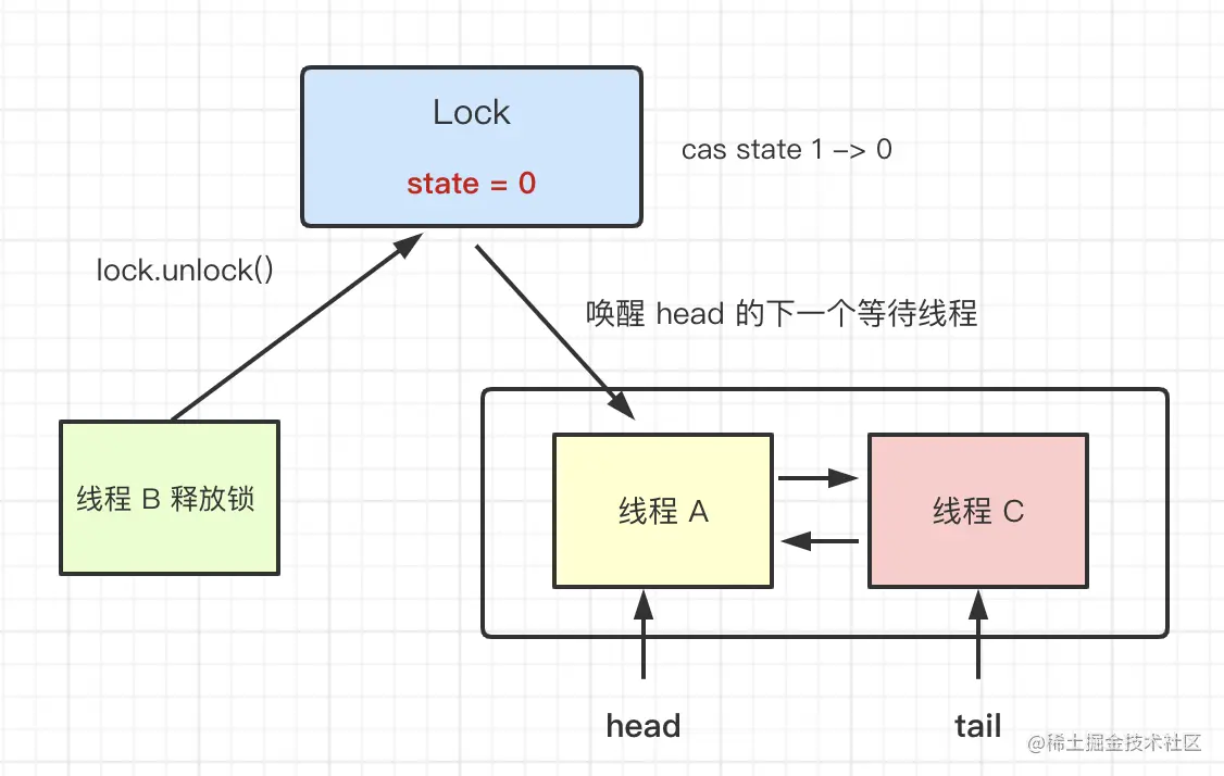 state更新为 0 - 唤醒等待队列中 head 的下一个节点线程 A