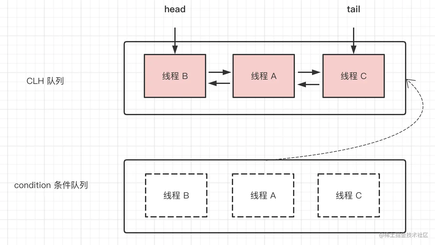 注意,条件队列中的线程是依次一个一个加入 CLH 队列的队尾。