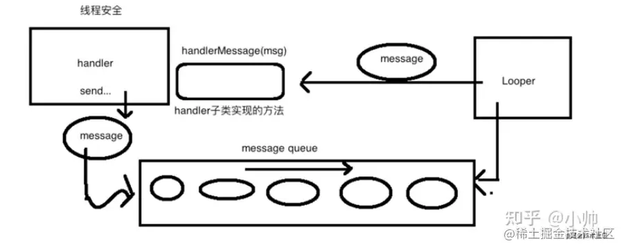 从消息的发送到消息的处理,经历了Handler-->MessageQueue-->Looper->Handler