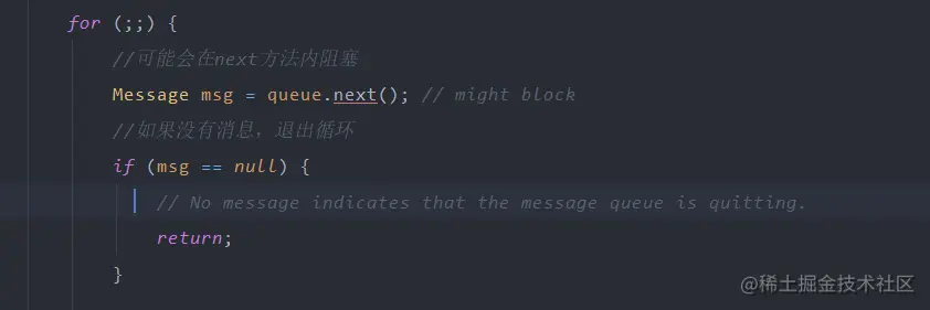 // 这里是消息队列阻塞( 死循环) 的重点,消息队列在阻塞的标示是消息队列中没有任何消息,