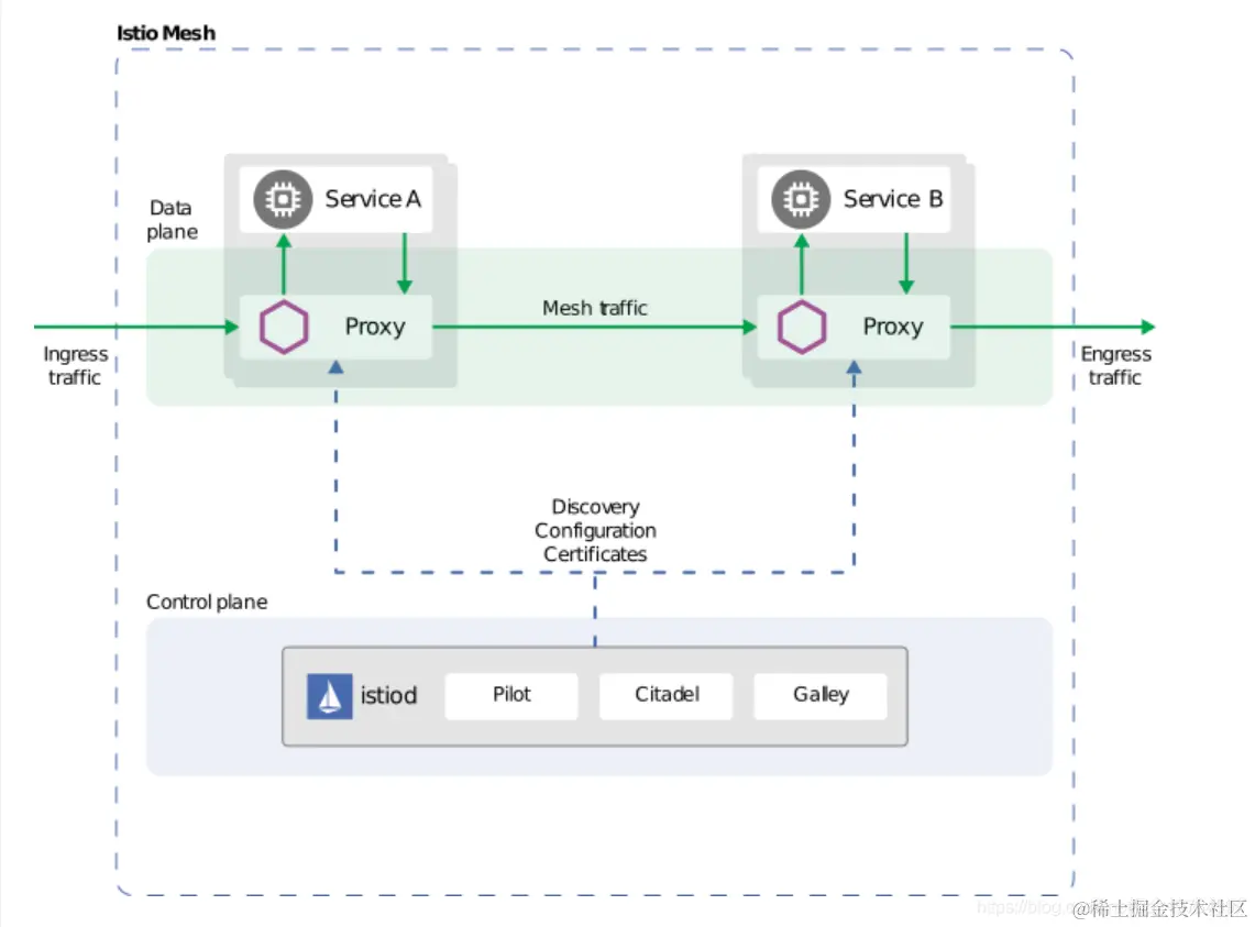 控制平面主要是对数据平面组件的管理和维护,因此形成了Istio Service Mesh最重要的层。