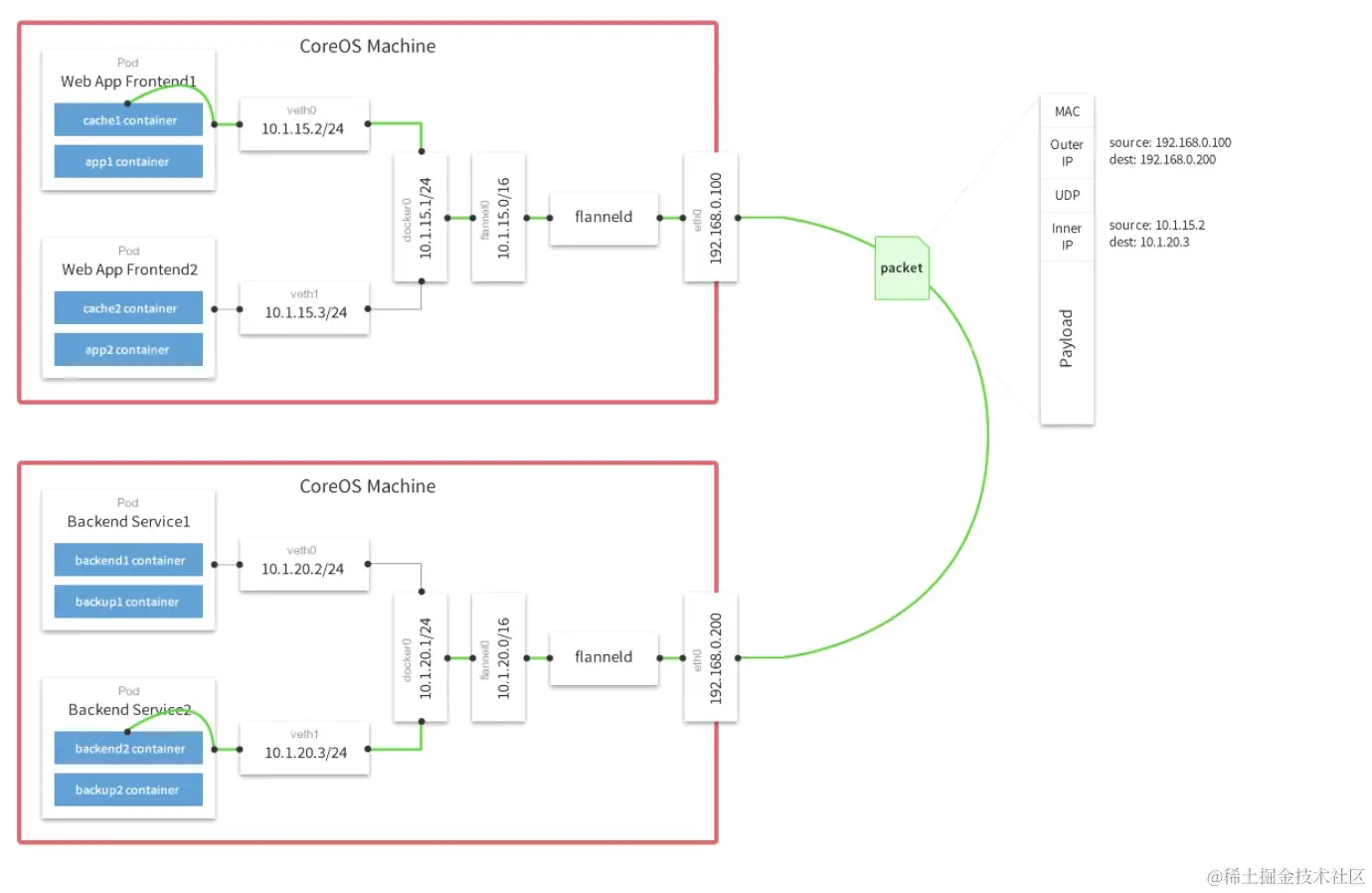 Flannel 是 cereos 开源的 CNI 网络插件,下图 Flannel 官网提供的一个数据包经过封包、传输以及拆包的示意图,从这个图片中可以看出两台机器的docker0分别处于不同的段:10.1.20.1/24 和 10.1.15.1/24 ,如果从Web App Frontend1 pod(10.1.15.2)去连接另一台主机上的Backend Service2 pod(10.1.20.3),网络包从宿主机192.168.0.100发往192.168.0.200,内层容器的数据包被封装到宿主机的UDP里面,并且在外层包装了宿主机的IP和mac地址。这就是一个经典的overlay网络,因为容器的IP是一个内部IP,无法从跨宿主机通信,所以容器的网络互通,需要承载到宿主机的网络之上。