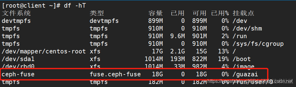 id=admin,conf=/etc/ceph/ceph.conf /guazai fuse.ceph defaults,_netdev 0 0