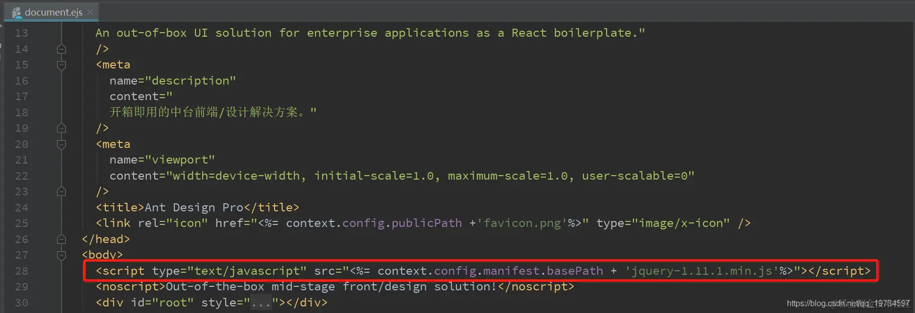由于WebUploader依赖Jquery,所以在最开始我们应该引入Jquery,我们使用的前端脚手架是Ant Design,所以我在 src/pages/document.ejs 文件中引入,代码如下: