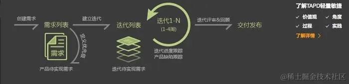 从创建需求、建立版本迭代、迭代进度跟踪和缺陷管理、到迭代评审回归,到最终交付发布,代表一个轻量的敏捷流程。
