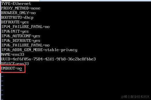 将网卡配置文件里的 ONBOOT=no,改为ONBOOT=yes,然后保存并退出(不要忘记保存!!)