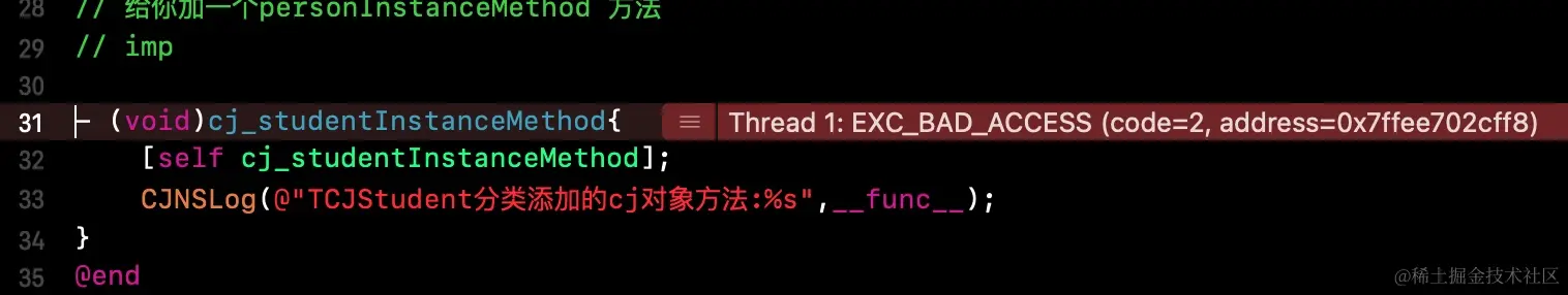 [student personInstanceMethod];中不报错是因为student中的imp交换成了cj_studentInstanceMethod,而TCJStudent中有这个方法(在TCJ分类中),所以不会报错.- 崩溃的点在于