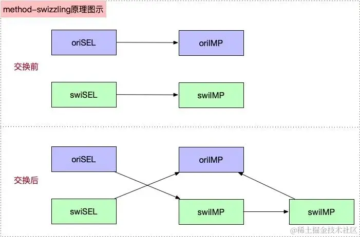 方法列表,即methodList,methodList中有不同的方法即Method,每个方法中包含了方法的sel和IMP,方法交换就是将sel和imp原本的对应断开,并将sel和新的IMP生成对应关系. 如下图所示,交换前后的sel和IMP的对应关系