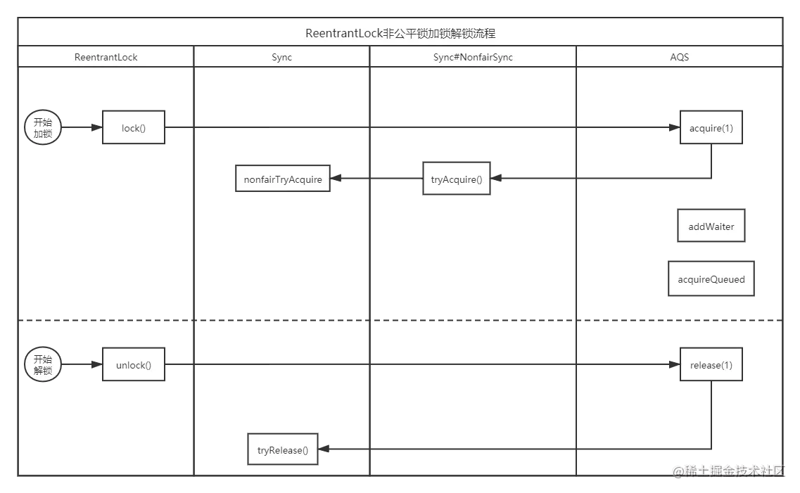 ReentrantLock与AQS关系的其实很简单,AQS相当于一个制定标准的组织,其他任何人和机构想要使用我的功能,必须实现我制定的标准。AQS制定的标准就是,所以子类继承我AQS之后,都需要实现我定义的方法,如tryAcquire 和 tryRelease 等(他里面有很多方法,具体实现哪个子类根据自己的功能来定)。这些方法不是通过子类的对象直接来调用的,是AQS自己内部封装好自己调用的,结合阻塞队列一起使用的。所以ReentrantLock类的lock方法是调用AQS的acquire,AQS的acquire方法调用tryAcquire和加入阻塞队列等方法,加入队列的方法是AQS的核心功能,所以不用继承的子类自己实现。以ReentrantLock的非公平锁为例,看下图就能明白加锁和解锁方法调用流程了: