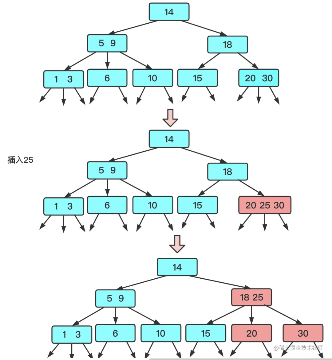 想办法让这个被删除的元素不可能出现在2节点中。如果发现删除元素树2节点则会从兄弟节点或父节点借个元素,当前2节点变为3节点或临时4节点,然后再删除目标数据。