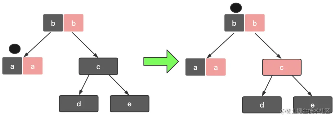 从关注节点 a 中去掉一个黑色,此时节点 a 就是单纯的红色或者黑色。