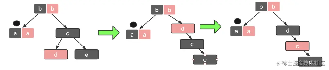 情况3:关注节点是 a,它的兄弟节点 c 是黑色,c 的左子节点 d 是红色,c 的右子节点 e 是黑色: