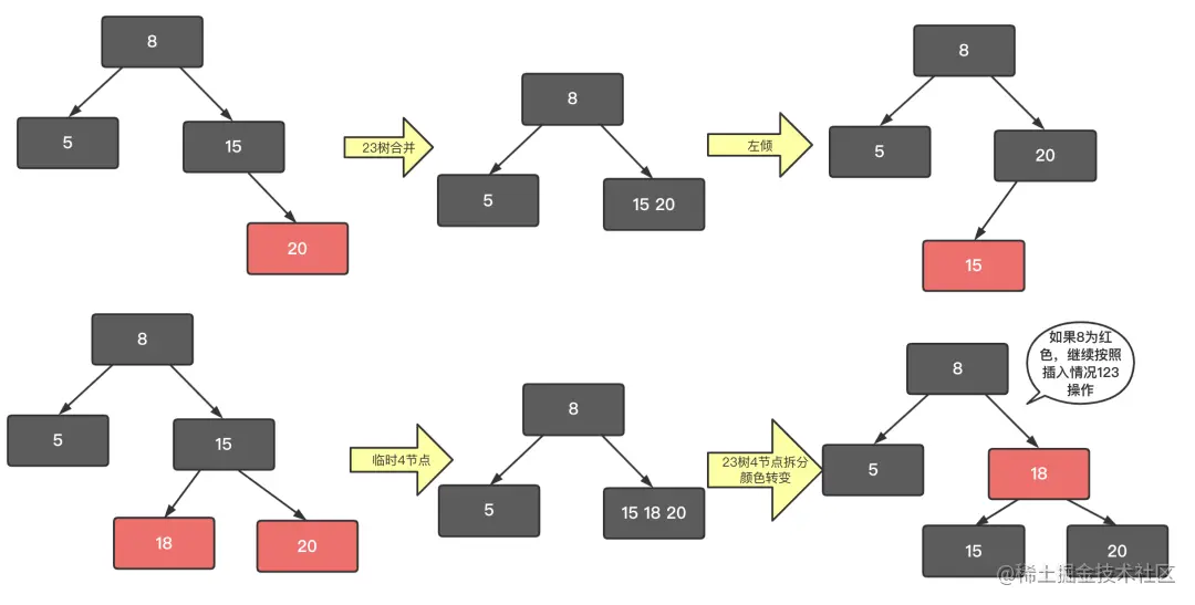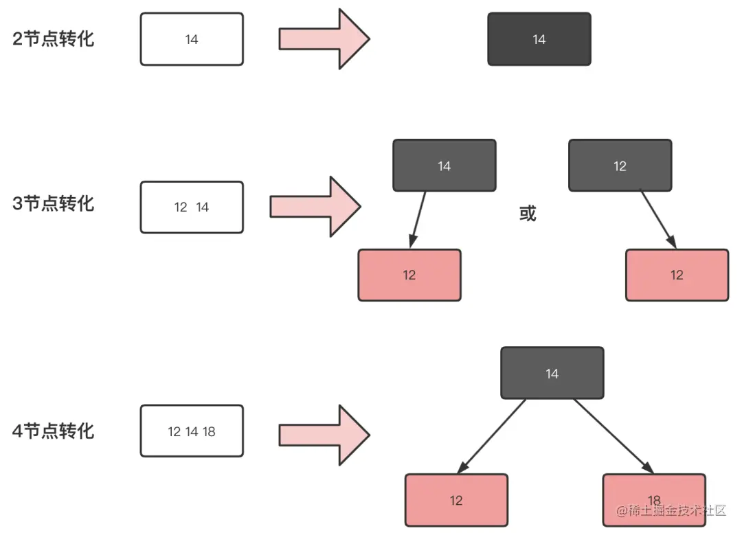 先看2-3树到红黑树的节点转换。2节点直接转化为黑色节点。3节点这里可以有两种表现形式,左倾红节点或者右倾红节点。而4节点被强制要求转化为一个黑父带着左右两个红色儿子。