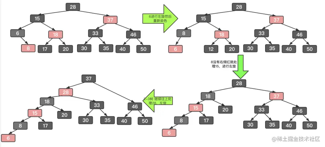 从宏观上来看从根节点开始查找,全程利用2-3树思维逐层对红黑树调整,每次保证当前节点树2-3树中非2节点,如果是非2节点则看下一层,如果是2节点则根据兄弟节点调整。