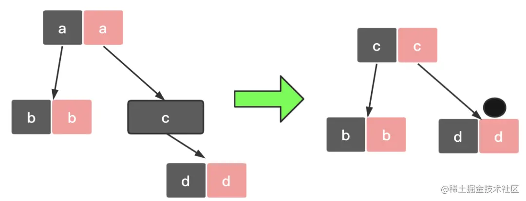 如果节点 c 是黑色,为了不违反红黑树的路径相同原则,给节点 c 的右子节点 d 多加一个黑色圆圈,这个时候节点 d 就成了红 - 黑或者黑 - 黑。