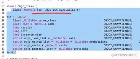 这样我们看最后那种红色部分,确实是有个isa,此时怎么处理呢?我们可以定义一个一摸一样的结构体来替换一下class就行了如下代码: