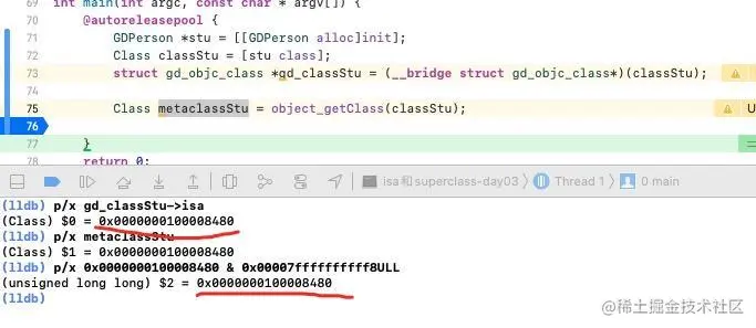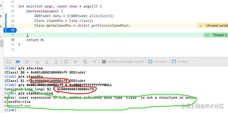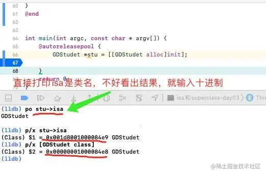 从上面的截图运行结果可以看出stu的isa的0x001d8001000084e9 和GDStudent的isa的0x00000001000084e8并不一样,跟我们之前说的结果不一致?