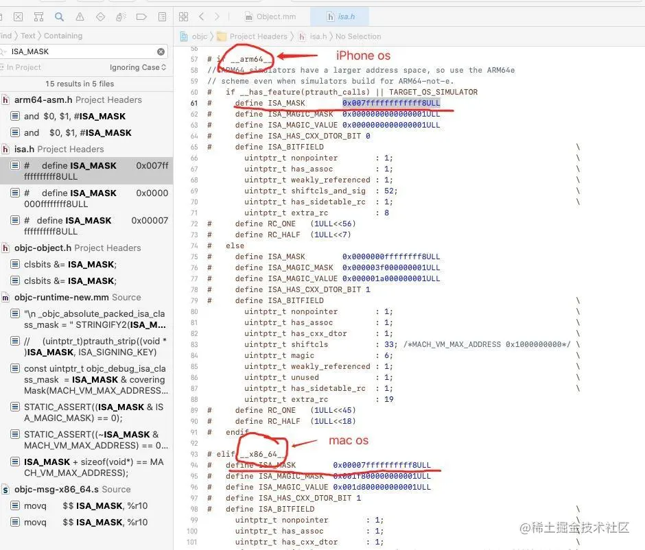 其实啊,在arm64之前,也就是iPhone 5s之前其实是一致的,而在arm64以后它需要一个&位运算操作,需要stu的isa与ISA_MASK这个常量位运算一次,也就是