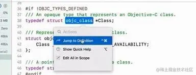 细心的同学可能可能发现我们无法输出classStu的isa,就像上面的绿色不是structure,我们点一下class的jump to Definition查看它的源码定义